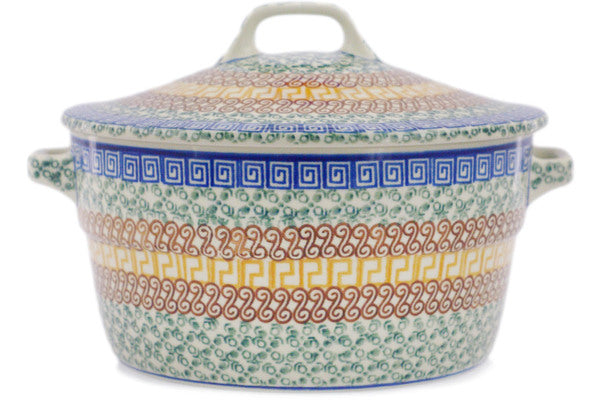 This Polish Pottery 9" Baker with Cover with Handles - Grecian Sea is handmade and handpainted by the Ceramika Artystyczna factory in Boleslawiec, Poland.