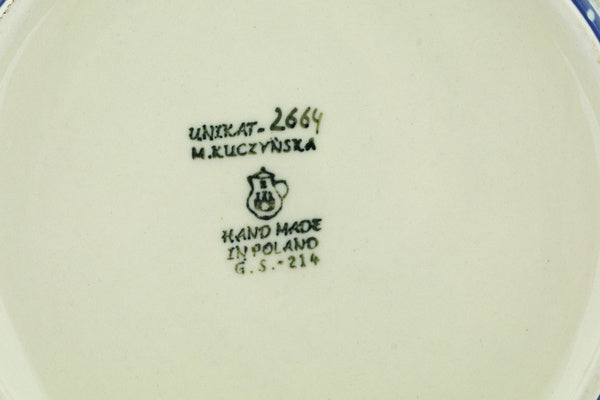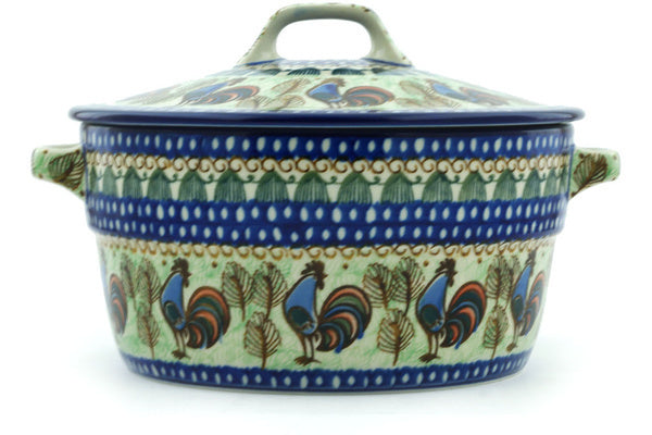 This Polish Pottery 9" Baker with Cover with Handles - Rooster Row is handmade and handpainted by the Ceramika Artystyczna factory in Boleslawiec, Poland.