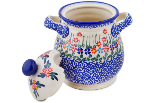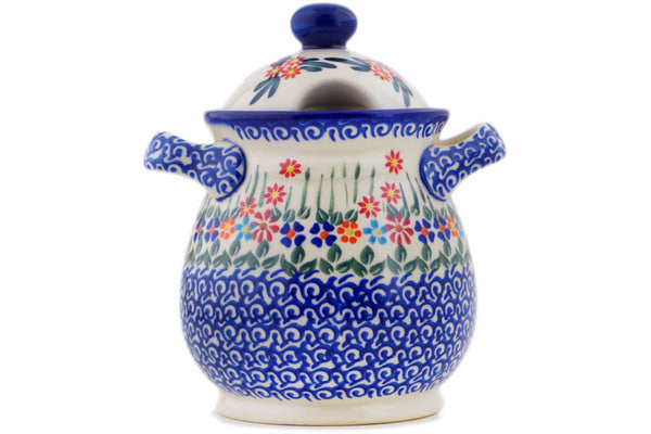 This Polish Pottery 8" Jar with Lid and Handles - Blissful Daisy is handmade and handpainted by the Ceramika Bona factory in Boleslawiec, Poland.