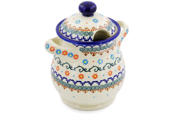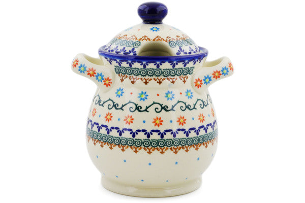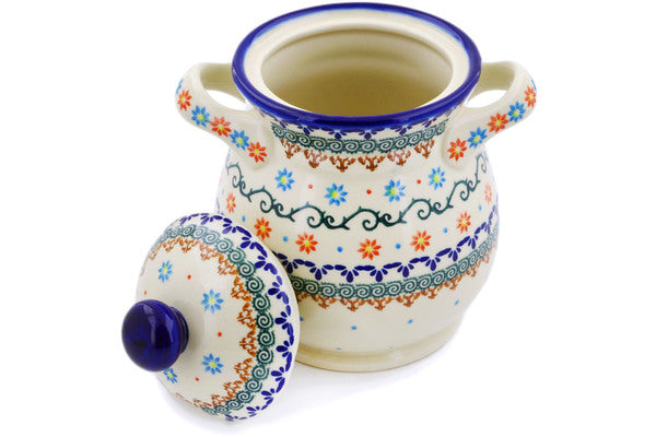 This Polish Pottery 8" Jar with Lid and Handles - Sunflower Dance is handmade and handpainted by the Ceramika Bona factory in Boleslawiec, Poland.