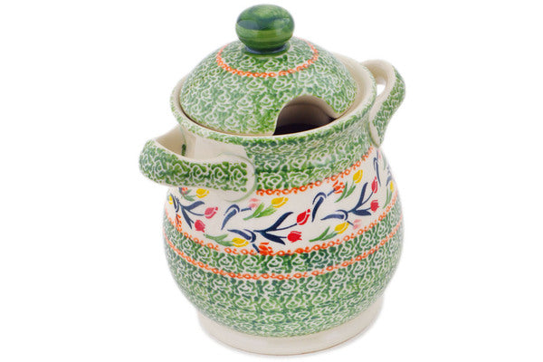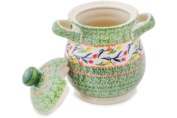 This Polish Pottery 8" Jar with Lid and Handles - Tulip Ring is handmade and handpainted by the Ceramika Bona factory in Boleslawiec, Poland.