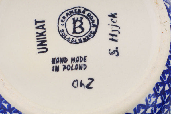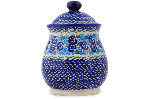This Polish Pottery 8" Jar with Lid - Blue Kiss Blooms is handmade and handpainted by the Ceramika Bona factory in Boleslawiec, Poland.