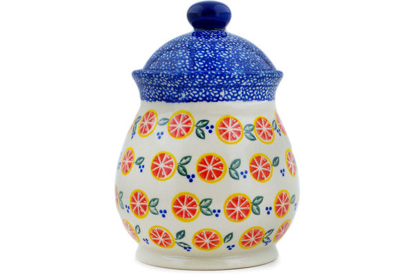 This Polish Pottery 8" Jar with Lid - Citrus Craze is handmade and handpainted by the Ceramika Bona factory in Boleslawiec, Poland.