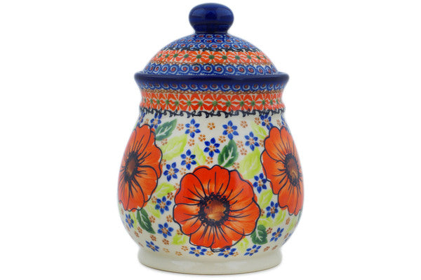 This Polish Pottery 8" Jar with Lid - Orange Zinnia is handmade and handpainted by the Ceramika Nina factory in Boleslawiec, Poland.