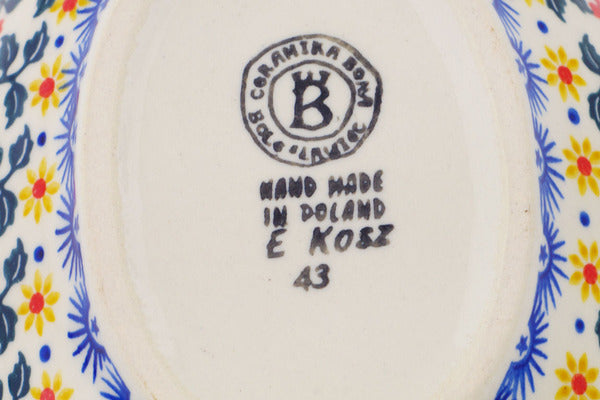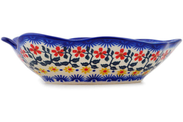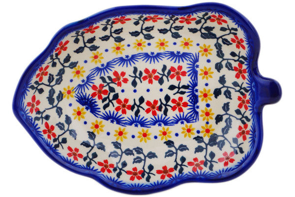 This Polish Pottery 8" Leaf Shaped Bowl - Sunflower Dance is handmade and handpainted by the Ceramika Bona factory in Boleslawiec, Poland.