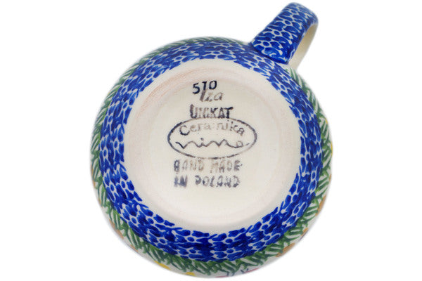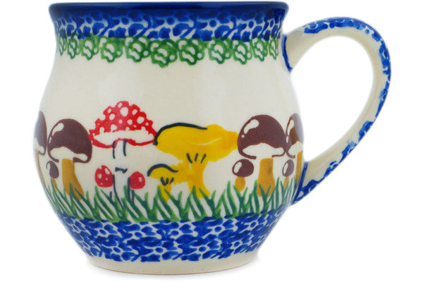 This Polish Pottery 8 oz Bubble Mug - Wild Mushroom Picking is handmade and handpainted by the Ceramika Nina factory in Boleslawiec, Poland.