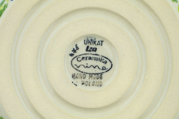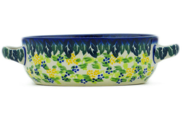 This Polish Pottery 8" Round Baker with Handles - Blue Happy Fields is handmade and handpainted by the Ceramika Nina factory in Boleslawiec, Poland.