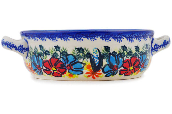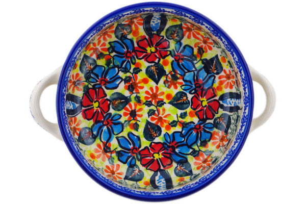 This Polish Pottery 8" Round Baker with Handles - Bold Poppies is handmade and handpainted by the Ceramika Bona factory in Boleslawiec, Poland.