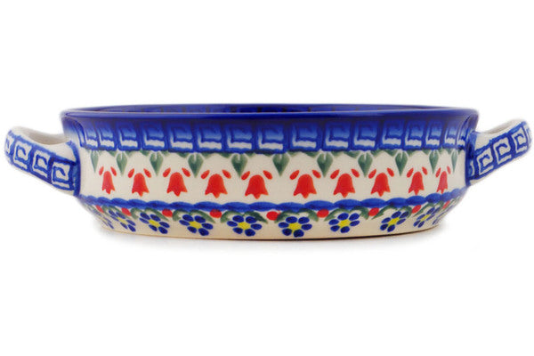 This Polish Pottery 8" Round Baker with Handles - Brilliant Butterfly Popp is handmade and handpainted by the Ceramika Bona factory in Boleslawiec, Poland.