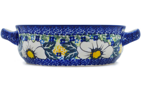 This Polish Pottery 8" Round Baker with Handles - Floral Fantasy is handmade and handpainted by the Ceramika Nina factory in Boleslawiec, Poland.