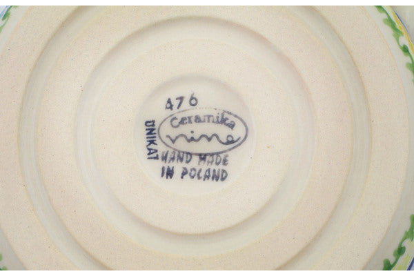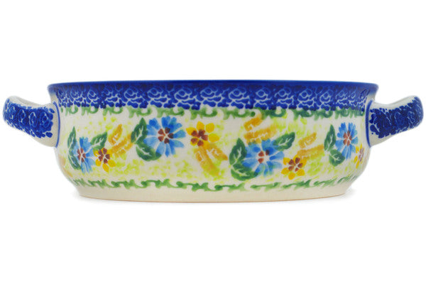This Polish Pottery 8" Round Baker with Handles - Gnomeo And Juliet is handmade and handpainted by the Ceramika Nina factory in Boleslawiec, Poland.