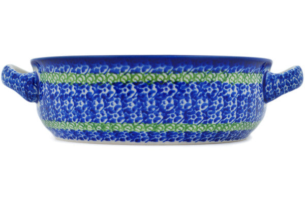 This Polish Pottery 8" Round Baker with Handles - Mushroom Garden is handmade and handpainted by the Ceramika Nina factory in Boleslawiec, Poland.