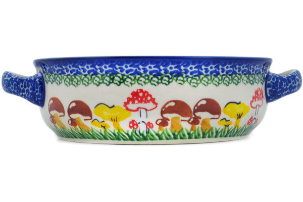 This Polish Pottery 8" Round Baker with Handles - Wild Mushroom Picking is handmade and handpainted by the Ceramika Nina factory in Boleslawiec, Poland.