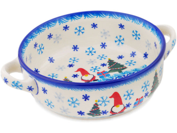 This Polish Pottery 8" Round Baker with Handles - Winter Gnome is handmade and handpainted by the Ceramika Bona factory in Boleslawiec, Poland.