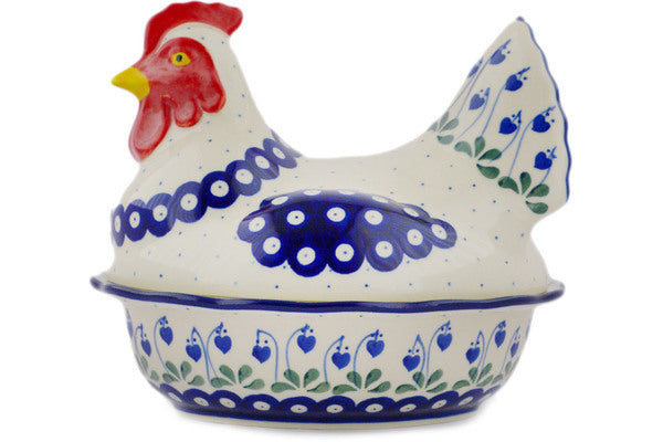 This Polish Pottery 9" Hen Shaped Jar - Bleeding Heart Peacock is handmade and handpainted by the Ceramika Artystyczna factory in Boleslawiec, Poland.