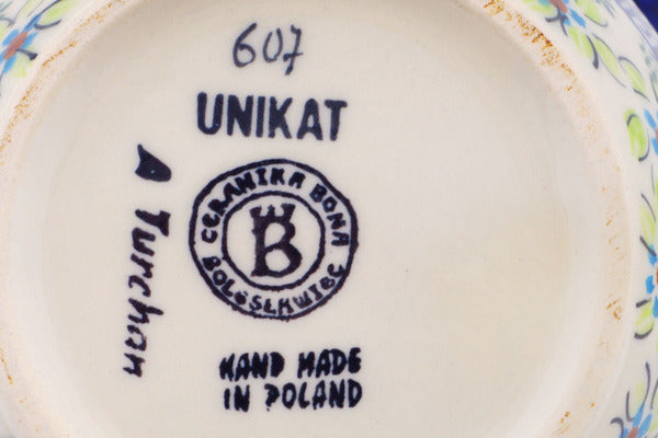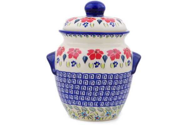 This Polish Pottery 9" Jar with Lid and Handles - Grecian Fields is handmade and handpainted by the Ceramika Bona factory in Boleslawiec, Poland.
