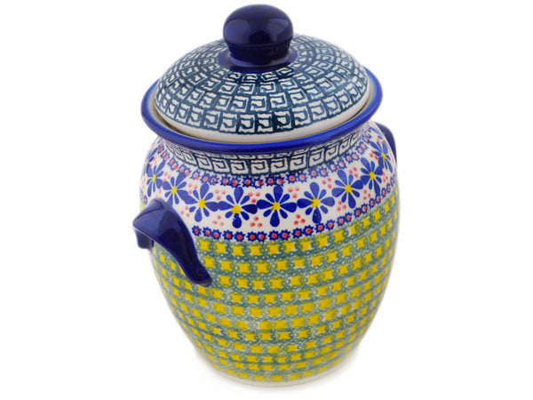 This Polish Pottery 9" Jar with Lid and Handles - Irish Spring is handmade and handpainted by the Ceramika Bona factory in Boleslawiec, Poland.