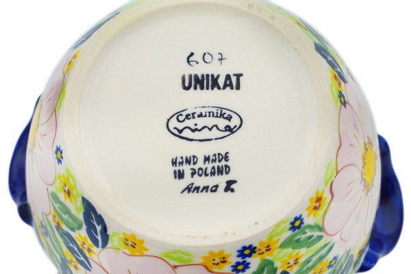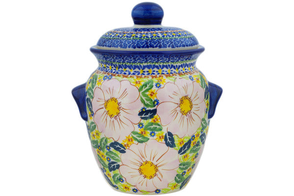 This Polish Pottery 9" Jar with Lid and Handles - Pink Delight is handmade and handpainted by the Ceramika Nina factory in Boleslawiec, Poland.
