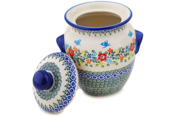 This Polish Pottery 9" Jar with Lid and Handles - Ring Of Meadow Flowers is handmade and handpainted by the Ceramika Bona factory in Boleslawiec, Poland.