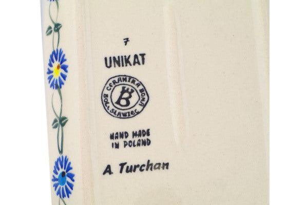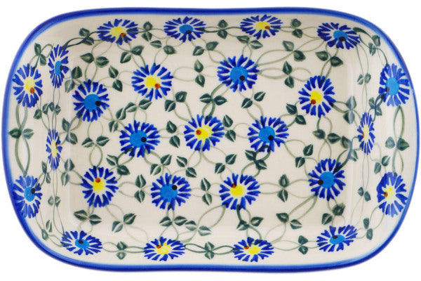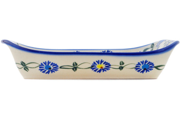 This Polish Pottery 9" Platter with Handles - Blue Thistle Beauty is handmade and handpainted by the Ceramika Bona factory in Boleslawiec, Poland.