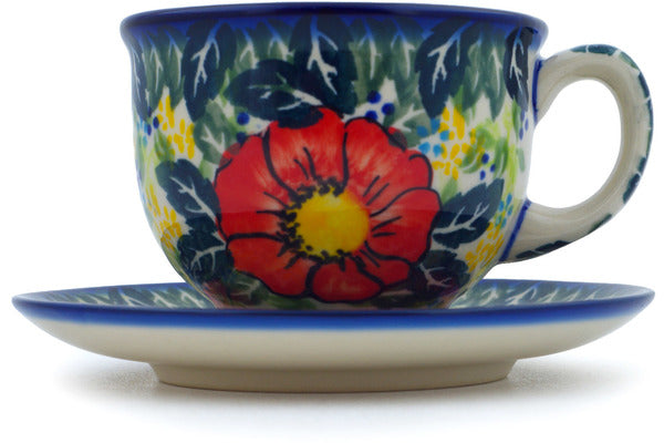 This Polish Pottery 7 oz Cup with Saucer - Bloom Tales is handmade and handpainted by the Ceramika Nina factory in Boleslawiec, Poland.