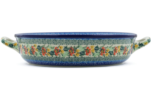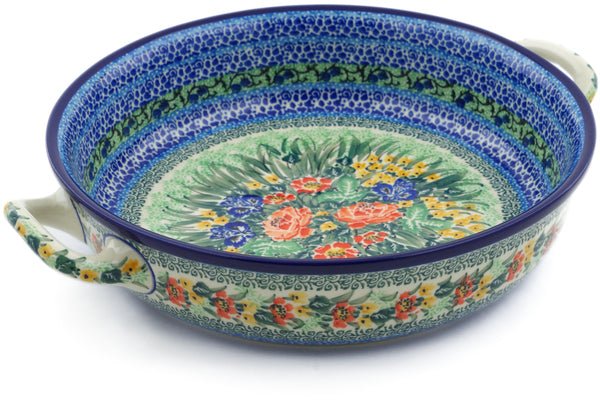 This Polish Pottery 13" Round Baker with Handles - Splendid Meadow is handmade and handpainted by the Ceramika Artystyczna factory in Boleslawiec, Poland.