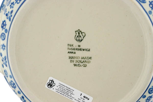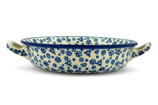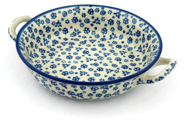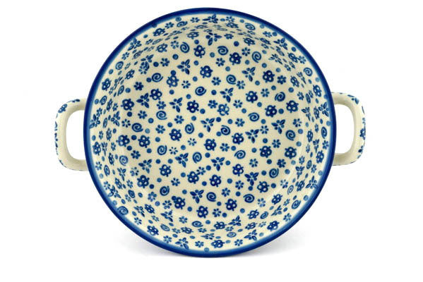 This Polish Pottery 10" Round Baker with Handles - Blue Confetti is handmade and handpainted by the Ceramika Artystyczna factory in Boleslawiec, Poland.