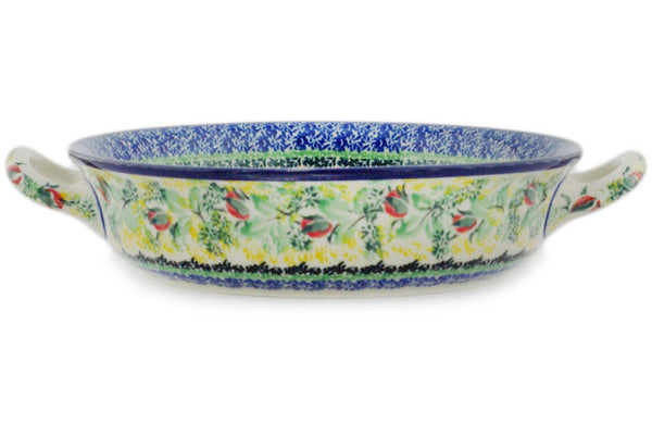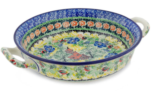 This Polish Pottery 10" Round Baker with Handles - Hidden Chalet is handmade and handpainted by the Ceramika Artystyczna factory in Boleslawiec, Poland.