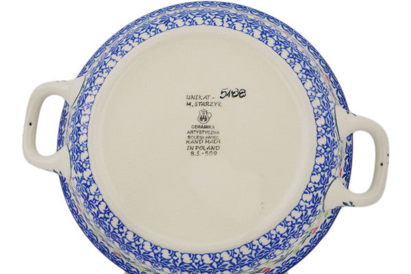 This Polish Pottery 10" Round Baker with Handles - Robin & Wren is handmade and handpainted by the Ceramika Artystyczna factory in Boleslawiec, Poland.