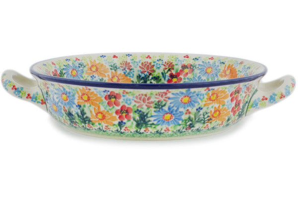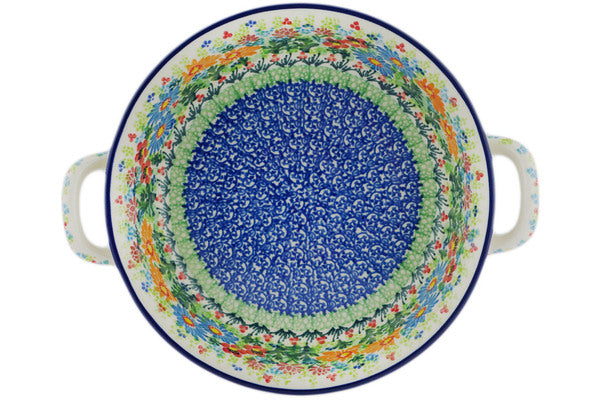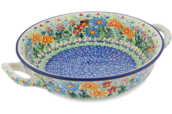 This Polish Pottery 10" Round Baker with Handles - U5237 is handmade and handpainted by the Ceramika Artystyczna factory in Boleslawiec, Poland.