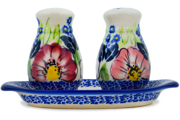 This Polish Pottery 7" Salt and Pepper Set - Maroon Blossoms is handmade and handpainted by the Ceramika Nina factory in Boleslawiec, Poland.