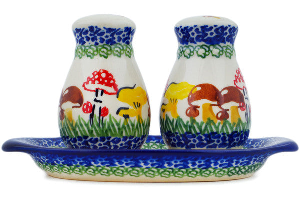 This Polish Pottery 7" Salt and Pepper Set - Wild Mushroom Picking is handmade and handpainted by the Ceramika Nina factory in Boleslawiec, Poland.