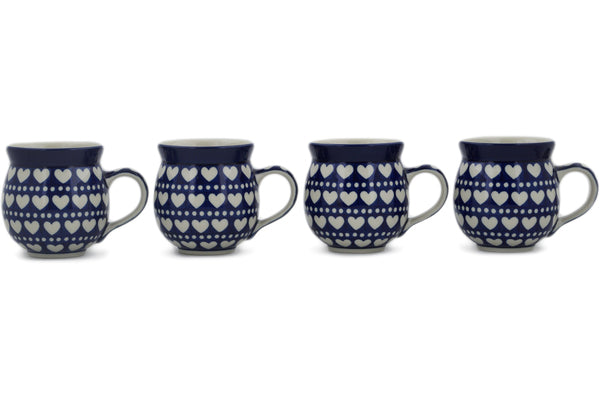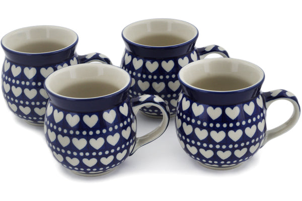 This Polish Pottery 12 oz Set of 4 Mugs - Heart To Heart is handmade and handpainted by the Ceramika Artystyczna factory in Boleslawiec, Poland.