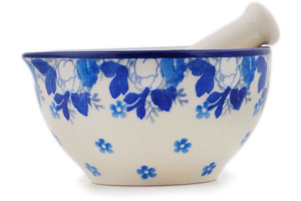 This Polish Pottery 3" Mortar and Pestle - Blue Spring is handmade and handpainted by the Ceramika Artystyczna factory in Boleslawiec, Poland.