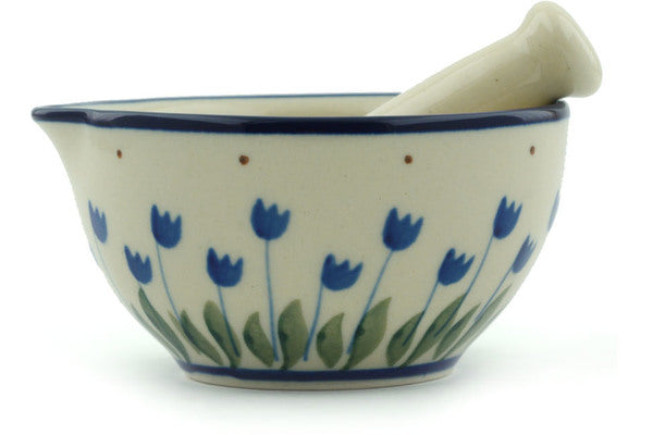 This Polish Pottery 3" Mortar and Pestle - Water Tulip is handmade and handpainted by the Ceramika Artystyczna factory in Boleslawiec, Poland.