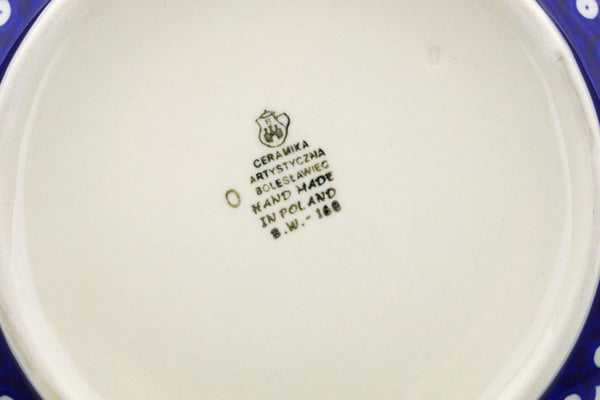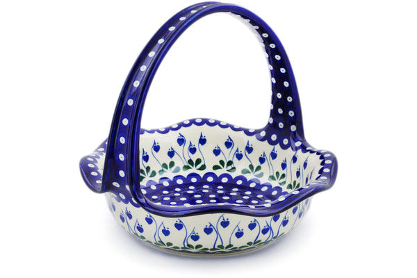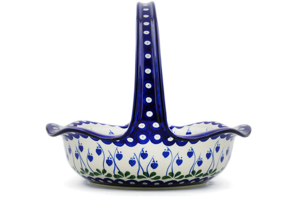 This Polish Pottery 11" Basket with Handle - Bleeding Heart Peacock is handmade and handpainted by the Ceramika Artystyczna factory in Boleslawiec, Poland.