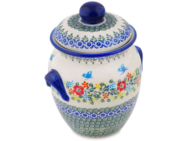 This Polish Pottery 9" Jar with Lid and Handles - Ring Of Meadow Flowers is handmade and handpainted by the Ceramika Bona factory in Boleslawiec, Poland.