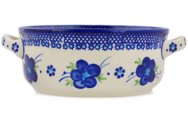 This Polish Pottery 8" Round Baker with Handles - Bleu-Belle Fleur is handmade and handpainted by the Ceramika Bona factory in Boleslawiec, Poland.