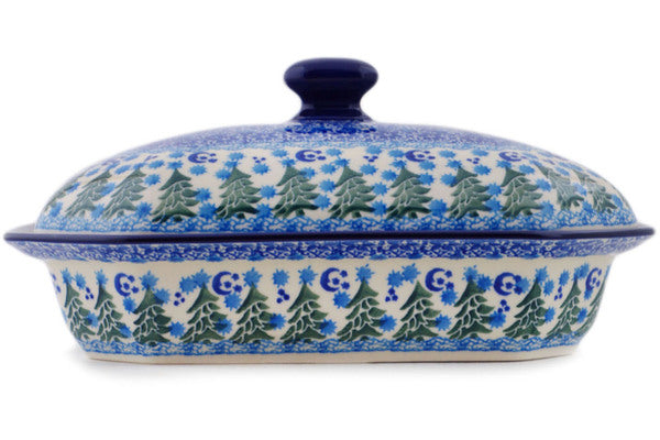 This Polish Pottery 10" Dish with Cover - Evergreen Night is handmade and handpainted by the Ceramika Artystyczna factory in Boleslawiec, Poland.