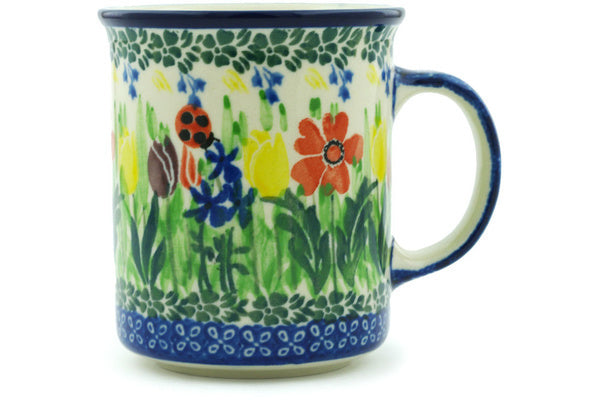 This Polish Pottery 10 oz Mug - Lady Bug Tulips is handmade and handpainted by the Ceramika Artystyczna factory in Boleslawiec, Poland.