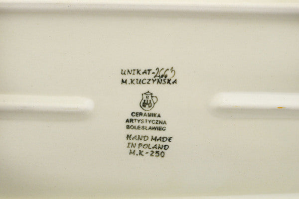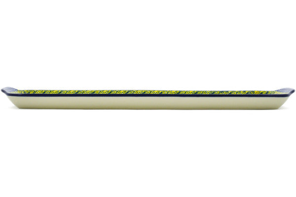 This Polish Pottery 16" Platter with Handles - Rooster Parade is handmade and handpainted by the Ceramika Artystyczna factory in Boleslawiec, Poland.