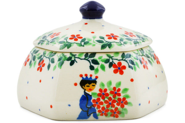 This Polish Pottery 4" Jar with Lid - Charming Prince is handmade and handpainted by the Ceramika Artystyczna factory in Boleslawiec, Poland.