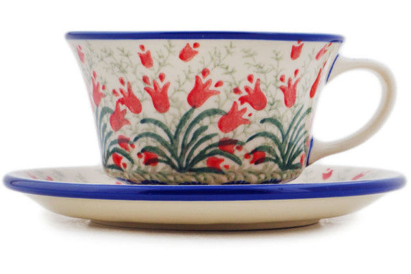 This Polish Pottery 8 oz Cup with Saucer - Crimson Bells is handmade and handpainted by the Ceramika Artystyczna factory in Boleslawiec, Poland.