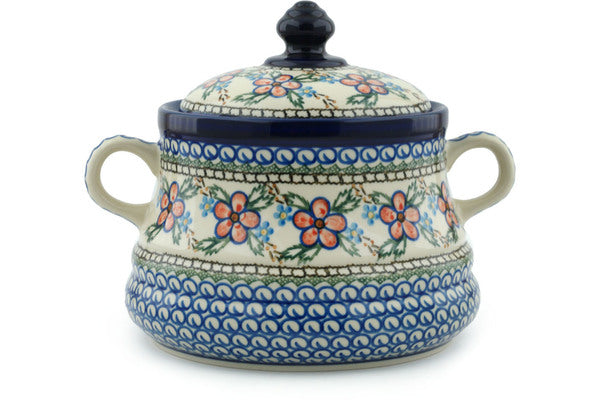 This Polish Pottery 9" Jar with Lid and Handles - Lancaster Rose is handmade and handpainted by the Ceramika Artystyczna factory in Boleslawiec, Poland.