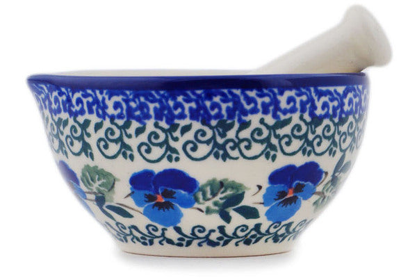 This Polish Pottery 3" Mortar and Pestle - Blue Pansy is handmade and handpainted by the Ceramika Artystyczna factory in Boleslawiec, Poland.