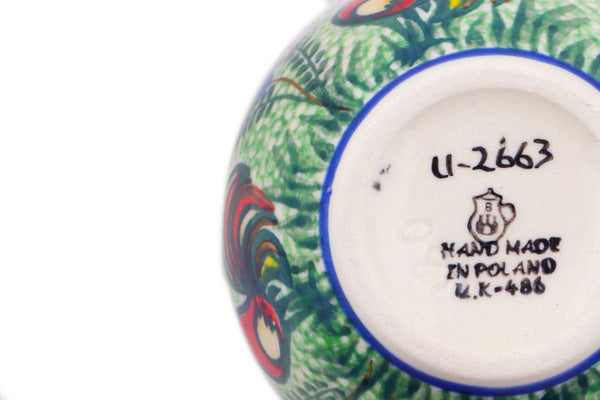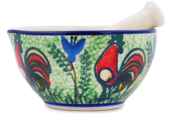 This Polish Pottery 3" Mortar and Pestle - Rooster Parade is handmade and handpainted by the Ceramika Artystyczna factory in Boleslawiec, Poland.
