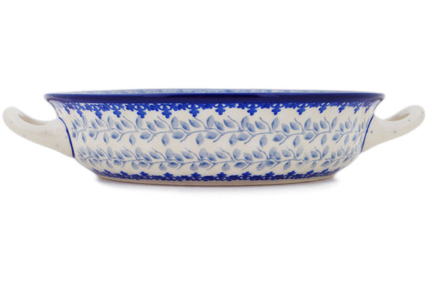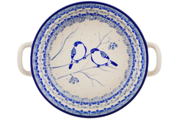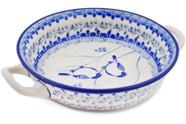 This Polish Pottery 8" Round Baker with Handles - Waiting Birds is handmade and handpainted by the Ceramika Artystyczna factory in Boleslawiec, Poland.