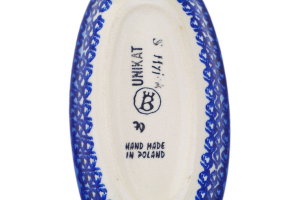 This Polish Pottery 7" Condiment Dish - Blue Kiss Blooms is handmade and handpainted by the Ceramika Bona factory in Boleslawiec, Poland.