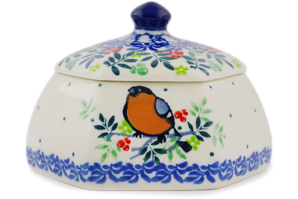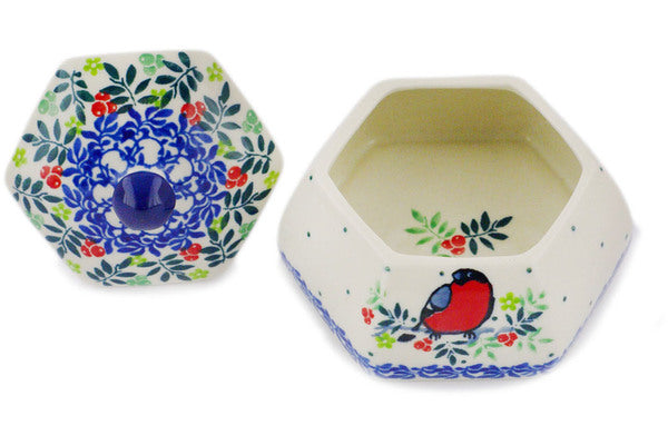 This Polish Pottery 4" Jar with Lid - Robin & Wren is handmade and handpainted by the Ceramika Artystyczna factory in Boleslawiec, Poland.