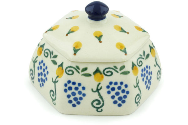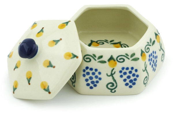 This Polish Pottery 4" Jar with Lid - Summer Grapes is handmade and handpainted by the Ceramika Artystyczna factory in Boleslawiec, Poland.